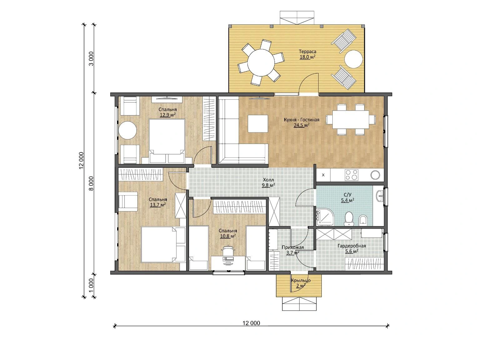 Помимо этого, отдохнуть можно не только дома, но и на улице — на террасе — 18 квадратов! Нужно лишь обставить ее мебелью, и можно звать гостей. Кроме того, наличие крыльца (2 м2) расширяет входную зону и защищает от непогоды.